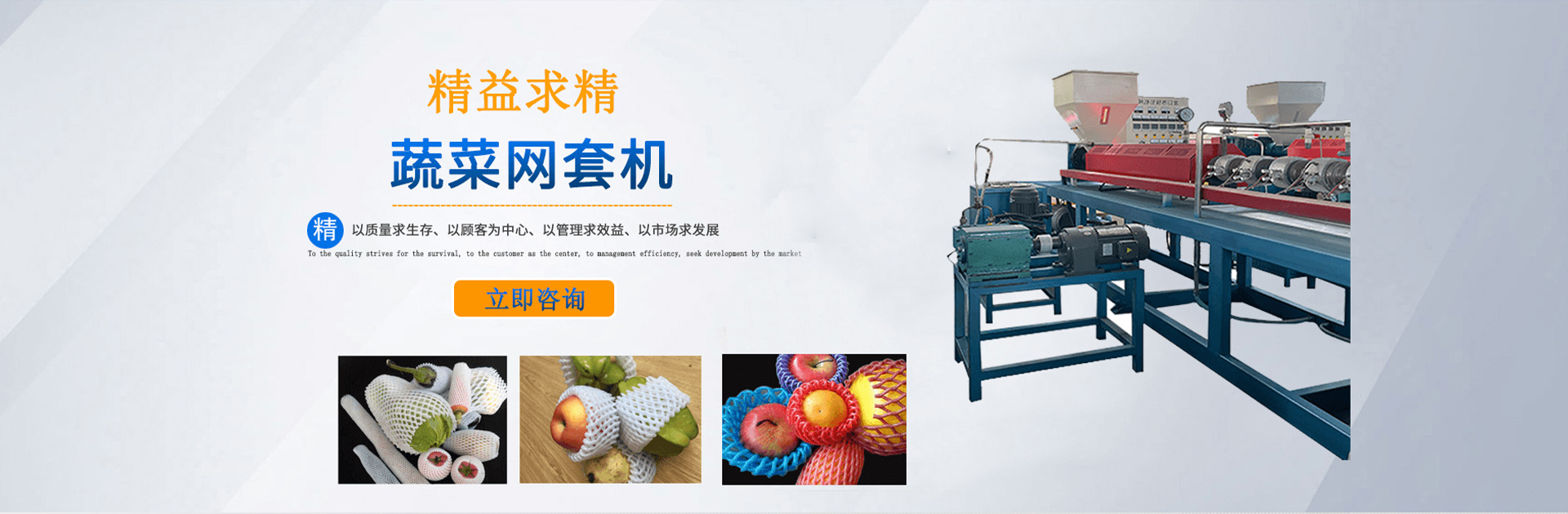 本公司創(chuàng)建于2002年,是一家集研發(fā)、加工、制作為一體,專門制作水果、蔬菜、玻璃器皿等發(fā)泡軟包裝設備的生產廠家。公司擁有眾多專業(yè)骨干人員,技術力量雄厚,可提供全套的售前及售后一條龍全方位服務。公司主營EPE發(fā)泡網套機、EPE發(fā)泡棒自動化設備。是深受業(yè)界好評的網套機生產廠家,我廠生產的網套機價格合理,歡迎新老客戶前臺詢價!
